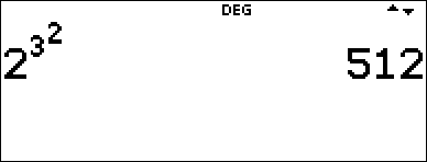 Im MathPrint™ Modus werden mit der Taste G eingegebenePotenzen von rechts nach links abgearbeitet. Der Ausdruck 2^3^2 würde also als 2^(3^2) = 512 ausgerechnet.