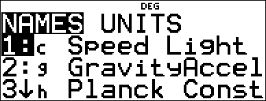 Über die Konstanten-Funktion können Sie physikalische Konstanten in Ihre Berechnungen auf dem TI-30X Plus MathPrint™ Rechner einfügen. Drücken Sie % , um das Menü zu öffnen, und dann ! oder ", um das Untermenü NAMES oder UNITS aufzurufen. Beide Untermenüs enthalten die gleichen 20 physikalischen Konstanten. Mit # und $ können Sie jeweils durch die Liste blättern. Das Menü NAMES zeigt neben dem Zeichen für die Konstante auch eine Kurzbezeichnung an. Das Menü UNITS enthält die gleichen Konstanten wie NAMES, es wird jedoch nur die Maßeinheit angezeigt.