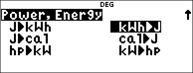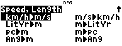 Im Menü CONVERSIONS können Sie Umrechnungen zwischen 20 Kombinationen von Maßeinheiten durchführen (also 40 verschiedene Umrechnungen, wenn beide Richtungen gezählt werden). Die Umrechnung muss am Ende eines Ausdrucks durchgeführt werden. Der Wert des ganzen Ausdrucks wird umgerechnet. Umrechnungen können in Variablen gespeichert werden.