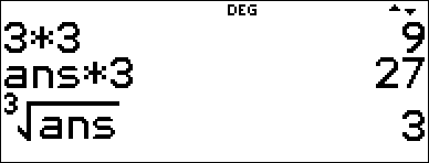 Le résultat de la dernière entrée exécutée sur l'écran de calcul est stockée dans la variable ans. Cette variable est conservée en mémoire, même après la mise hors tension de la calculatrice. Pour rappeler la valeur de la variable ans :
