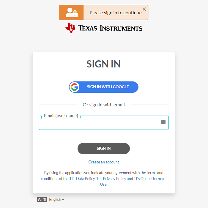 Cela a pour effet d'ouvrir la page de connexion de Texas Instruments dans votre navigateur. Suivez la procédure de connexion avec un compte Google ou avec l'adresse e-mail associée à votre compte TI.