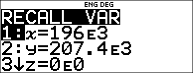 % h henter værdierne i variablerne. Tryk på % h for at få vist en menu med variabler og deres lagrede værdier. Marker den variabel, du vil hente, og tryk på <. Den værdi, der er tildelt variablen, indsættes i den aktuelle indtastning og bruges til at evaluere udtrykket.