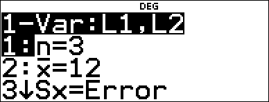 Displays a secondary menu of the last computed statistical result variables. Use $ and # to locate the desired variable, and press < to select it. If you select this option before calculating 1-Var stats, 2-Var stats, or any of the regressions, a reminder appears. |