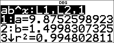 Fits the model equation y=abx to the data using a least-squares fit and transformed values x and ln(y). It displays values for a and b; it also displays values for r2 and r. |
