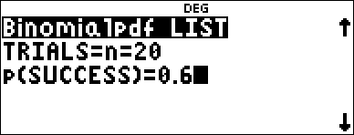 Computes a probability at x for the discrete binomial distribution with the specified numtrials and probability of success (p) on each trial. x is a non-negative integer and can be entered with options of SINGLE entry, LIST of entries or ALL (list of probabilities from 0 to numtrials is returned). 0 { p { 1 must be true. The probability density function (pdf) is: