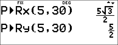 Muuntaa suorakulmaisesta napakoordinaatistoksi ja näyttää q:n arvon. Syntaksi: R ´Pq(x,y) |