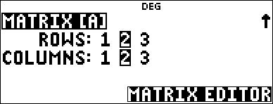 % t toont het matrixmenu NAMES, dat de dimensies van de matrices laat zien en ze in berekeningen door u laat gebruiken. De rij- en kolom-afmetingen van een matrix kunnen 1{rij{3 en 1{kolom{3 zijn.