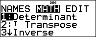 % t " toont het matrixmenu MATH, waarmee u de volgende bewerkingen kunt uitvoeren: