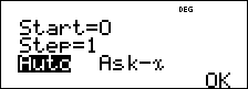 | 3. | Selezionare le opzioni Start della tabella, Step della tabella, Auto o Ask-x e premere <. |