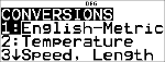 Zum Öffnen des Menüs CONVERSIONS drücken Sie % . Wählen Sie über die Zahlen 1 bis 5 oder durch Drücken von # und $ eines der Untermenüs von CONVERSIONS aus. Zu den Untermenüs gehören die Kategorien English-Metric (angloamerikanisches/metrisches System), Temperature, Speed and Length (Geschwindigkeit/Länge), Pressure (Druck) oder Power and Energy (Kraft/Energie).