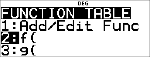 Permette di definire la funzione f(x) o g(x) o entrambe e genera una tabella di valori. La pressione del tasto r su un valore nella tabella alterna il formato numerico. |