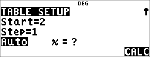 | 3. | Selezionare le opzioni Start della tabella, Step della tabella, Auto o Ask-x e premere <. |
