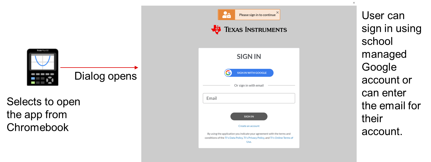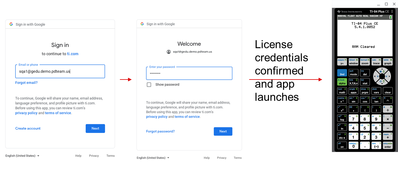 Email and password dialog boxes are presented by the Google single sign-on (SSO) interface. These screens are controlled by Google, but are familiar to users that use Google SSO for other applications.