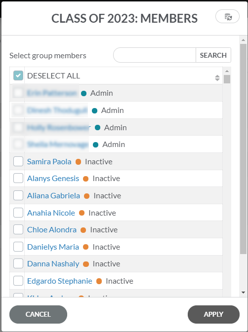 Nota: quando visualizar a opção “Membros”, são mostrados todos os membros da organização. Os que têm caixas de verificação são aqueles que pertencem ao grupo específico cujo nome é apresentado na parte superior da caixa de diálogo.