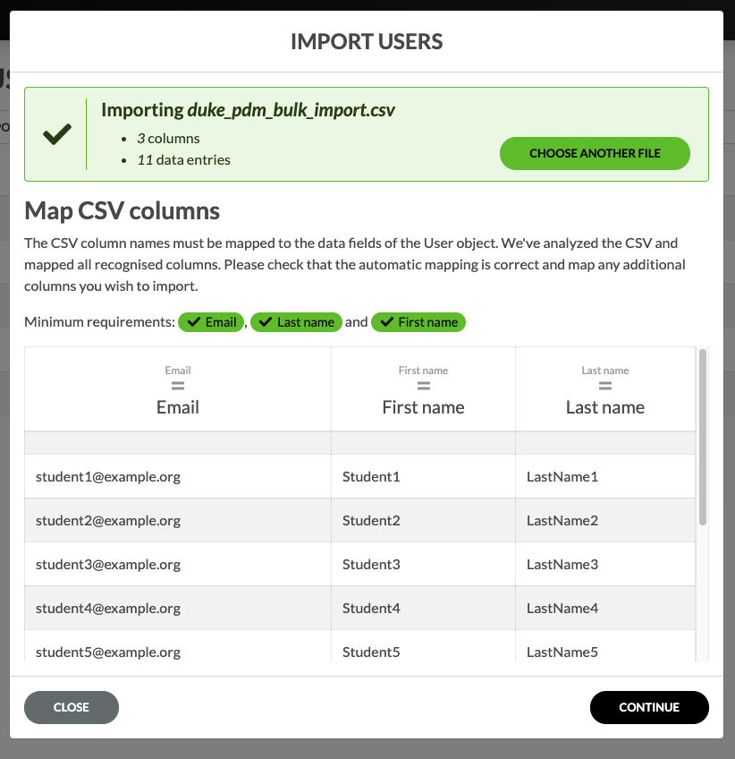 Zodra u het CSV-bestand hebt geselecteerd, zal het dialoogvenster Import Users de status tonen van het uitlijnen van het CSV-bestand met de gegevens die het licentiesysteem nodig heeft. Groen = in orde |