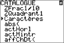 Le CATALOGUE de la TI-82 Advanced comprend une option nommée CARACTÈRES. Cette option figure sous plusieurs commandes en anglais dans le CATALOGUE. Vous pouvez l'utiliser afin d'accéder aux caractères spéciaux et aux accents pour l'affichage des messages et chaînes de caractères à stocker dans une variable. Vous ne pouvez pas utiliser ces caractères et accents dans les noms de variables.