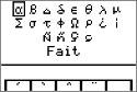Vous pouvez effectuer les opérations suivantes : Sélectionner un caractère spécial : Appuyez sur |, ~, † ou } pour déplacer la case sur le caractère spécial que vous souhaitez utiliser dans un message ou une chaîne de texte. Appuyez sur Í pour insérer le caractère sur la ligne de saisie. Appuyez sur |, ~, † ou } pour déplacer la case sur Terminé. Appuyez sur Í pour insérer le contenu de la ligne de saisie dans l'écran précédent. -ou- Ajouter un accent sur un caractère : Appuyez sur la touche de fonction (^, _, `, a ou b) qui se trouve juste au-dessus de l'accent pour le sélectionner. Le mode majuscules ALPHA est activé automatiquement. Pour écrire en minuscules, appuyez sur ƒ. Appuyez sur la touche associée au caractère alpha que vous souhaitez accentuer, par exemple, [A] (au-dessus de »). Le caractère accentué est affiché sur la ligne de saisie. Appuyez sur |, ~, † ou } pour déplacer la case sur Terminé. Appuyez sur Í pour insérer le contenu de la ligne de saisie dans l'écran précédent. |