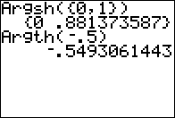 sh-1( correspond à la fonction argument sinus hyperbolique. ch-1( correspond à la fonction argument cosinus hyperbolique. th-1( correspond à la fonction argument tangente hyperbolique. Chacune de ces fonctions est valide pour des nombres réels, des expressions et des listes.