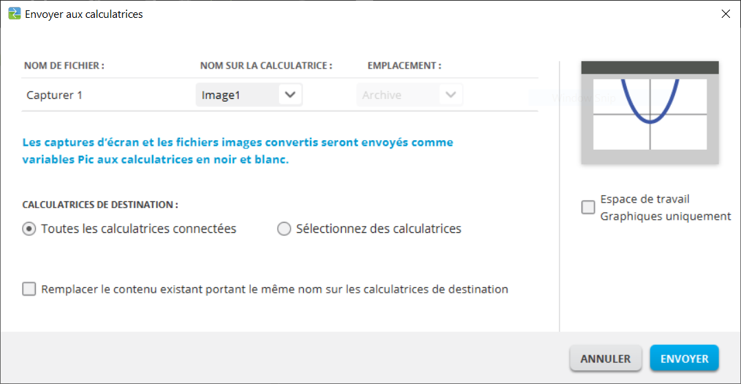 Pour envoyer des captures d'écran aux calculatrices connectées