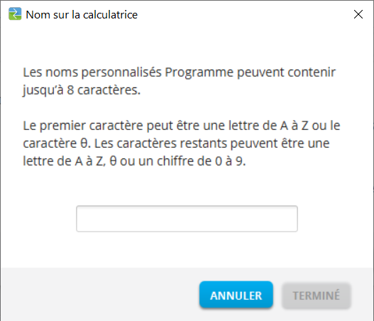 (NOM SUR LA CALCULATRICE) : sélectionnez le nom du programme (il doit s'agir du nom par défaut, mais vous pouvez changer le nom du programme en cliquant sur Custom [Personnaliser]). |