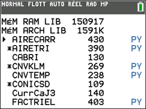 | - | vous ne souhaitez pas voir le chargement des AppVars Python dans l'expérience Python jusqu'à ce que vous décidiez de les déplacer de la mémoire Archive vers la RAM de la calculatrice. |