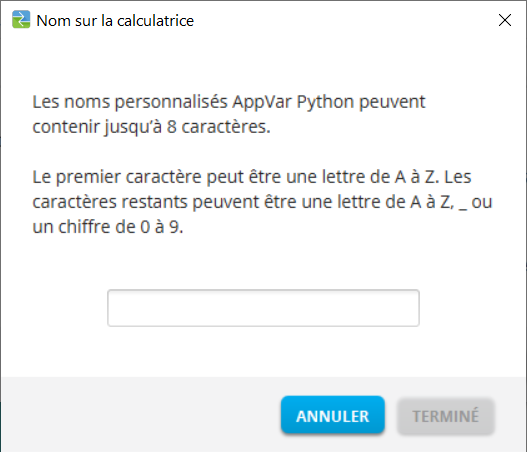 | • | Si le nom du fichier informatique suit les règles de dénomination de l'AppVar Python, alors le nom dans l'AppVar Python sur la calculatrice est automatiquement renseigné avec le nom du fichier informatique. Les règles de dénomination sont indiquées sur l'écran ci-dessus. |