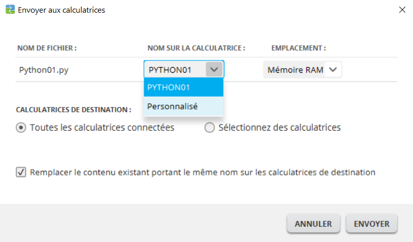 Lorsque vous envoyez un ou plusieurs fichiers de script *.py à l'aide de la fonction Envoyer aux calculatrices, l'action est similaire à l'envoi de n'importe quel autre fichier à la calculatrice.