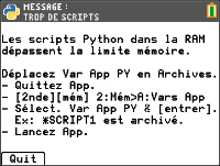 Vous tentez de créer un nouveau script ou de dupliquer un script Python existant déjà sur votre CE soit dans la RAM soit dans la mémoire Archive, ou désactivé pour le mode Examen. Saisissez un autre nom. |