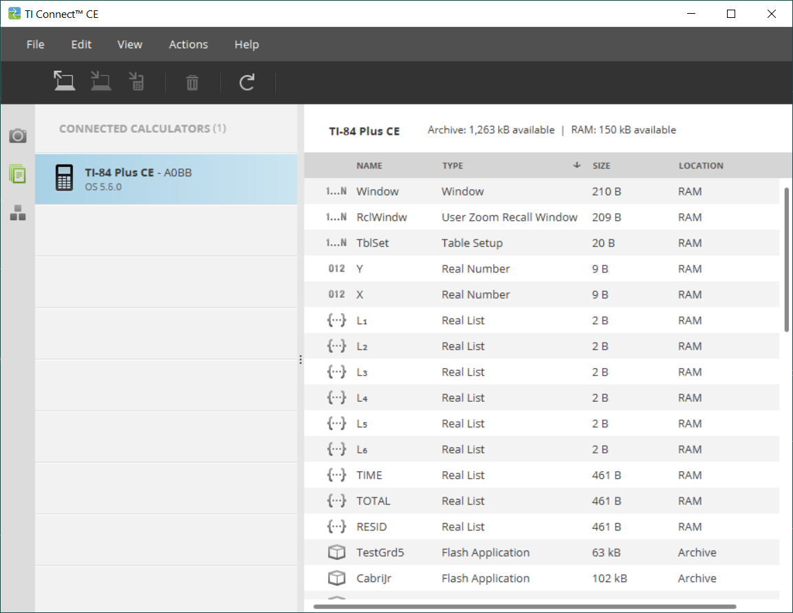 Fensterbereich Inhalte – Verwenden Sie diesen Fensterbereich, um den Bildschirm und die Dateien auf einem angeschlossenen Taschenrechner anzuzeigen und zu verwalten.