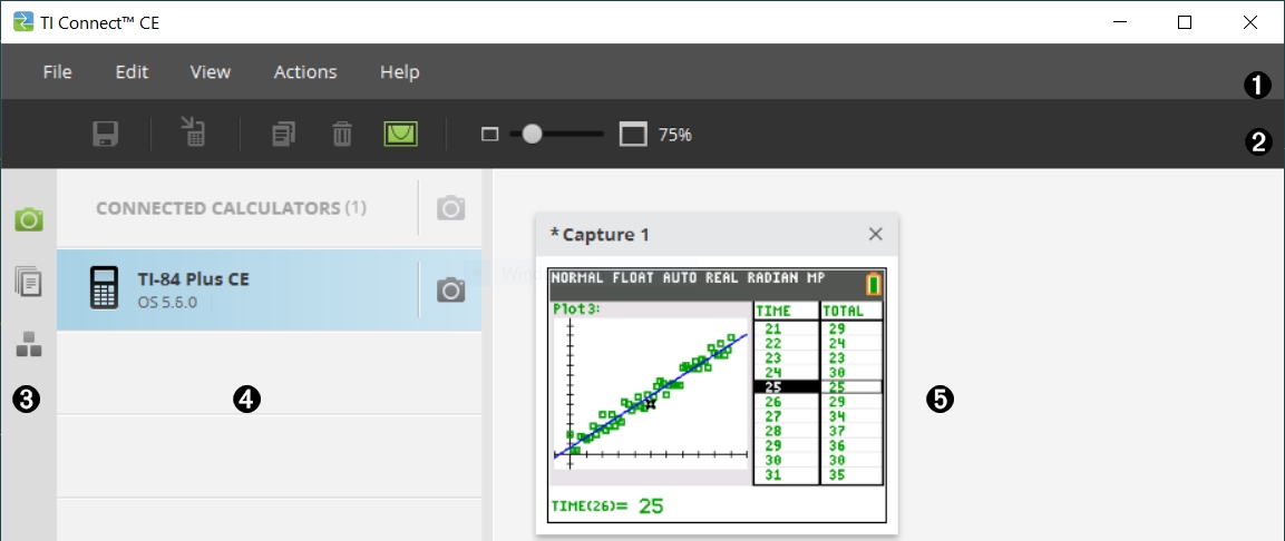 Fensterbereich Taschenrechnerliste – Verwenden Sie diese Liste, um alle angeschlossenen Taschenrechner anzuzeigen und einen Taschenrechner auszuwählen, der angezeigt werden soll.