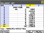 a) Drücken Sie die Tasten } und ~, um zur Zelle C1 zu scrollen, und geben Sie (über die Taste ƒ oder Alpha-Sperre y 7) “SALDO ein.