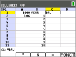 a) Scrollen Sie zur Zelle B1 und geben Sie (über die Taste ƒ oder Alpha-Sperre y 7) “JAHR ein.