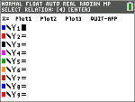 Drücken Sie eine beliebige Taste, um den Hauptbildschirm auszublenden. Der Cursor blinkt im erweiterten Ungleichungs-Y=Editor über dem Zeichen =. |