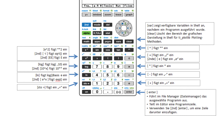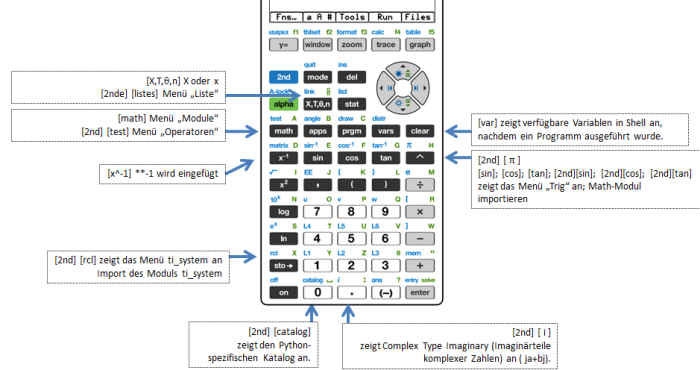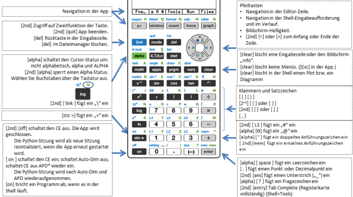 Wenn die Python-Anwendung läuft, ist die Tastatur so gestaltet, dass die entsprechenden Python-Operationen eingefügt oder Menüs geöffnet werden können, die für die einfache Eingabe von Funktionen, Schlüsselwörtern, Methoden, Operatoren usw. konzipiert sind. Wenn Sie y und ƒ drücken, erhalten Sie wie im Betriebssystem Zugriff auf die zweite und dritte Funktion einer Taste.