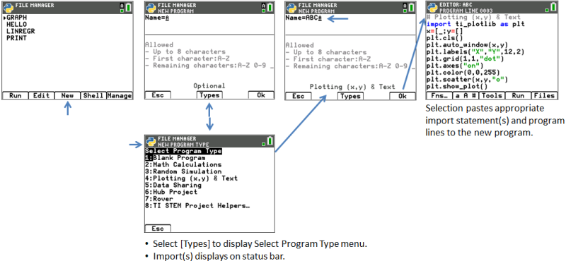 Wählen Sie [New], um einen neuen Programmnamen einzugeben und zum Editor zu wechseln, um Ihr neues Programm einzugeben. Wählen Sie im Bildschirm [New] die Option [Types] (drücken Sie hierzu [zoom]), um einen Programmtyp auszuwählen. Durch die Auswahl eines Programmtyps wird eine Vorlage von Import-Anweisungen und häufig verwendeten Funktionen und Methoden für diese Aktivität in Ihr neues Programm eingefügt. |
