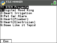 Wenn die AppVar TISTEMEN im Archiv geladen ist, wird der Menüpunkt „TI STEM Project Helpers...“ im Menü „Select Program Type“ aufgeführt. Wählen Sie die gewünschte STEM Activity-Vorlage, die Sie bei der Erstellung des neuen MINT-Programms unterstützt. |