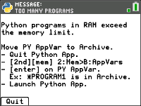 Speicherverwaltung Der verfügbare Speicher der Python-Umgebung beträgt maximal 100 Python-Programme (PY AppVars) oder 50K Speicherplatz. Die Module, die in dieser Python-Version mit der App gebündelt sind, teilen sich mit allen Dateien den gleichen Speicherplatz. |