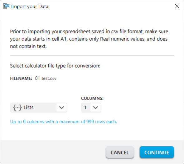 | - | Si los números decimales están representados con una coma en el archivo *.csv, el asistente de importación de datos no convertirá el archivo. Revise el formato de los números en el sistema operativo de su computadora y convierta el archivo *.csv de modo que use un punto como separador de decimales. El formato que usan el editor de matriz y la lista de calculadora CE para los números es, por ejemplo, 12.34 y no 12,34. |