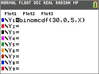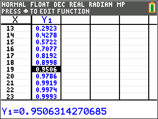 Método alternativo: Ajuste Y1=binomcdf(30,0.5,X) y utilice la tabla de valores (empezando en 0 incrementando en 1) para averiguar cuándo la probabilidad acumulada se encuentra en el nivel o justo por encima de la probabilidad acumulada dada. Esto ofrece una imagen de todos los valores para tomar decisiones. Para este ejemplo, en la tabla se encuentra que la probabilidad acumulada es ligeramente superior a 0,95. De nuevo, el número de éxitos es 19.