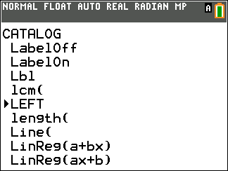 IZQUIERDA IZQUIERDA es un argumento final del comando invNorm( donde el argumento opcional final del comando puede ser IZQUIERDA (-∞,-a), CENTRO [-a,a] o DERECHA (a, ∞) para Real a. Consulte también invNorm(. |