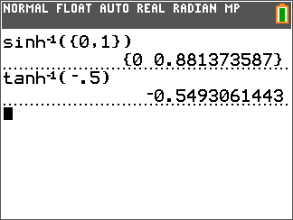 sinh-1( es la función arcoseno hiperbólico. cosh-1( es la función arcocoseno hiperbólico. tanh-1( es la función arcotangente hiperbólica. Cada una de ellas es válida para números reales, expresiones y listas.
