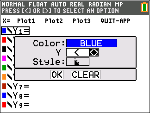 Pulse [enter]. Nota: La versión para TI-84 Plus CE de Inequality Graphing utiliza el mismo cuadro de diálogo de estilo de gráficos que el sistema operativo. La línea de ayuda de contexto en la barra de estado indica PULSE [<] O [>] PARA SELEC. UNA OPCIÓN. La selección de relación de la versión para TI-84 Plus C utiliza las teclas F1-F5 para cambiar el tipo de relación. |