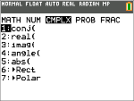 Para abrir los menús MATH (MATEMÁTICAS), pulse ». Pulse | o ~ para mostrar los menús de las órdenes NUM (Números), CMPLX (Complejos), PROB (Probabilidad) o FRAC (Fracciones).