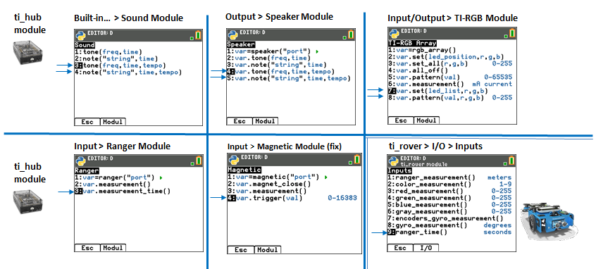 Los métodos ti_rover no se enumeran en Catalog y, por lo tanto, no se incluyen en la Guía de referencia. Utilice la información de la pantalla en los menús para conocer los argumentos y los detalles de los valores predeterminados o permitidos de los argumentos. Más información sobre la programación de Python para