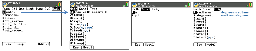 La pestaña de acceso directo [Fns…] muestra menús que contienen funciones, palabras clave y operadores que se usan con frecuencia en Python. Los menús también proporcionan acceso a las funciones y constantes seleccionadas de los Módulos y Módulos complementarios. Si bien puede usar el teclado para escribir carácter por carácter, estos menús ofrecen una forma rápida de pegar contenido en el Editor o Shell. Presione [Fns…] cuando esté en el Editor o Shell. Consulte también Uso del Catálogo de Python y Uso del teclado de Python para conocer otros métodos alternativos para ingresar datos.