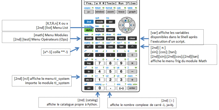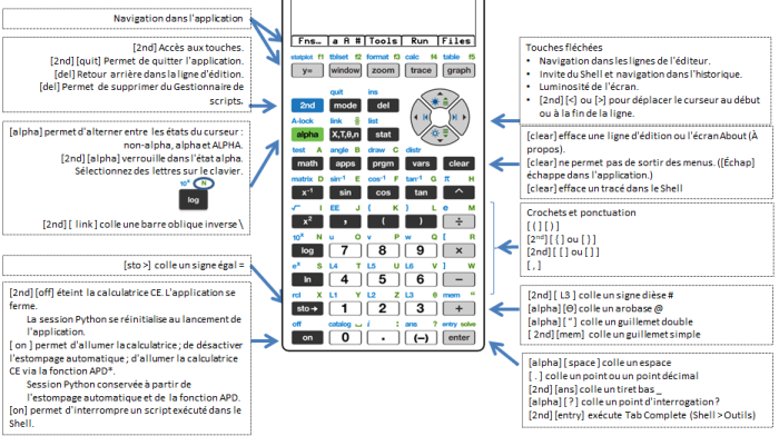 Lorsque l'application Python est en cours d'exécution, le clavier est prévu pour coller les opérations Python appropriées ou pour ouvrir des menus destinés à faciliter la saisie des fonctions, mots-clés, méthodes, opérateurs, etc. Les touches y et ƒ vous permettent d'accéder aux deuxième et troisième fonctions d'une touche comme dans le système d'exploitation.