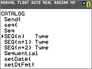 Sekv(n+2) I talföljdsläge ställer SEKV(n+2) in editorn för att ange talföljdsfunktioner av typen, u, v, eller w, som en funktion av den oberoende variabeln n+2. Kan även ställas in från editorn Y= i SEKV-läge. |