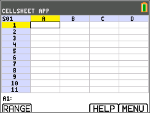 Tryck på valfri tangent för att visa kalkylbladet. Redigeringsraden med cellreferensen visas på vänster sida. Funktionstangenten Meny visas ovanför [F5], enligt listan i hjälpskärmen för CellSheet. |