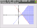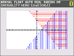 Tryck på s för att se de skuggade olikheterna. OBS: Den sammanhangsberoende hjälptexten i statusfältet visar INEQUALITY MENY: y /. Den här menyn innehåller verktyg för skärning av olikheter och andra funktioner. Versionen för TI-84 Plus C visar dessa verktyg som genvägarna [F1]–[F5] på grafskärmen. |