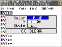 Tryck på [enter]. OBS: Versionen av Inequality Graphing för TI-84 Plus CE använder samma dialogruta för inställningar i grafstil som operativsystemet. Den sammanhangsberoende hjälptexten i statusfältet indikerar TRYCK PÅ [<] ELLER [>] FÖR ATT VÄLJA ETT ALTERNATIV. Versionen för TI-84 Plus C för relationsval använder genvägarna F1–F5 för att ändra typen av relation. |